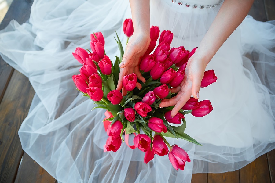 When it comes to tulip bridal bouquet ideas, restraint works best. A tight bundle of one color—white, soft pink, or even deep purple—creates a strong shape. No extra greens are required. Wrap the stems in fabric that matches the dress tone or keeps things neutral.